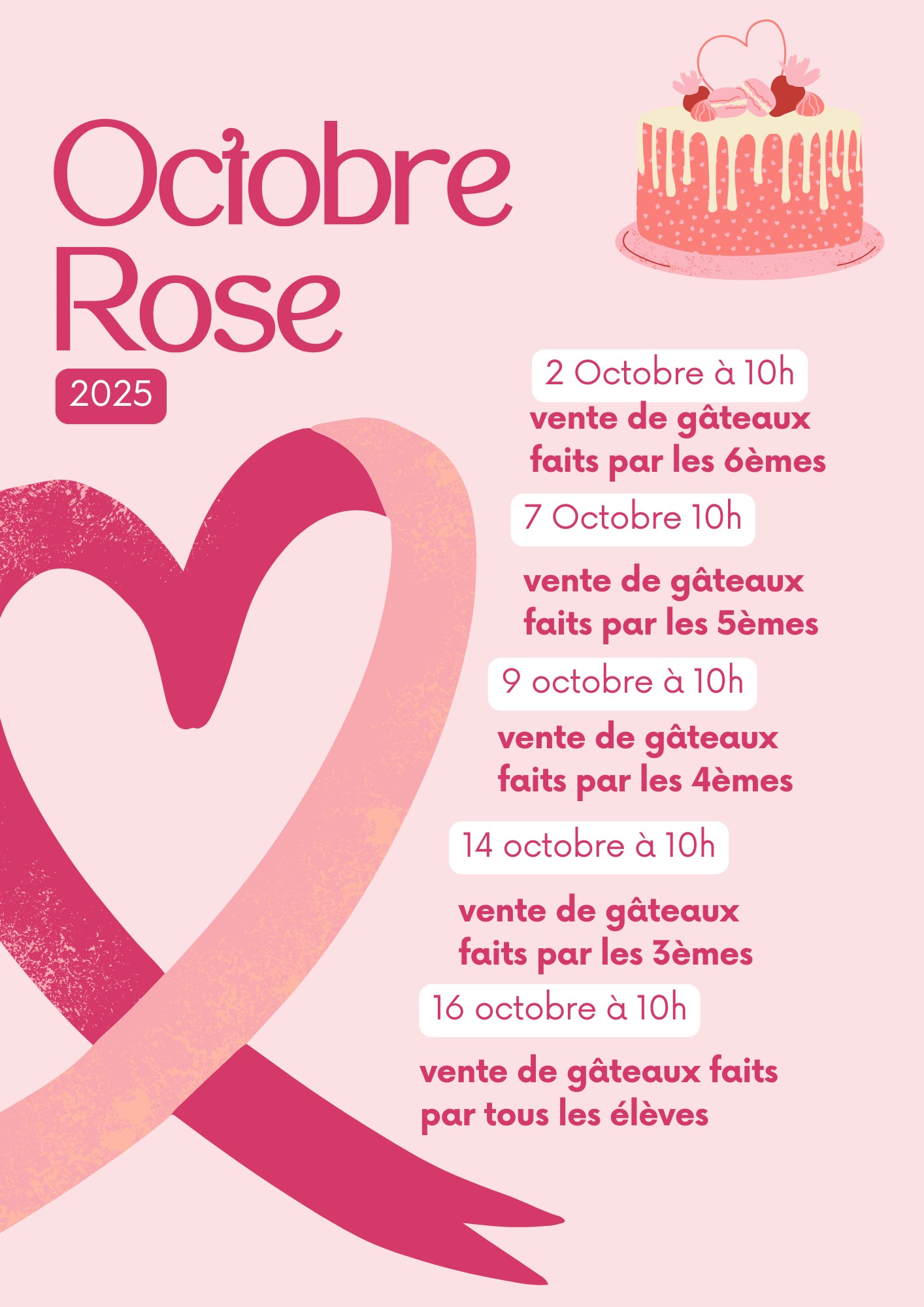 Comme l’an passé nous mettons en place des ventes de gâteaux  sur les récréations au collège (dates sur l’affiche), ainsi que des ventes de pin’s, bracelets…. afin de récolter un maximum d’argent à reverser à la ligue contre le cancer.