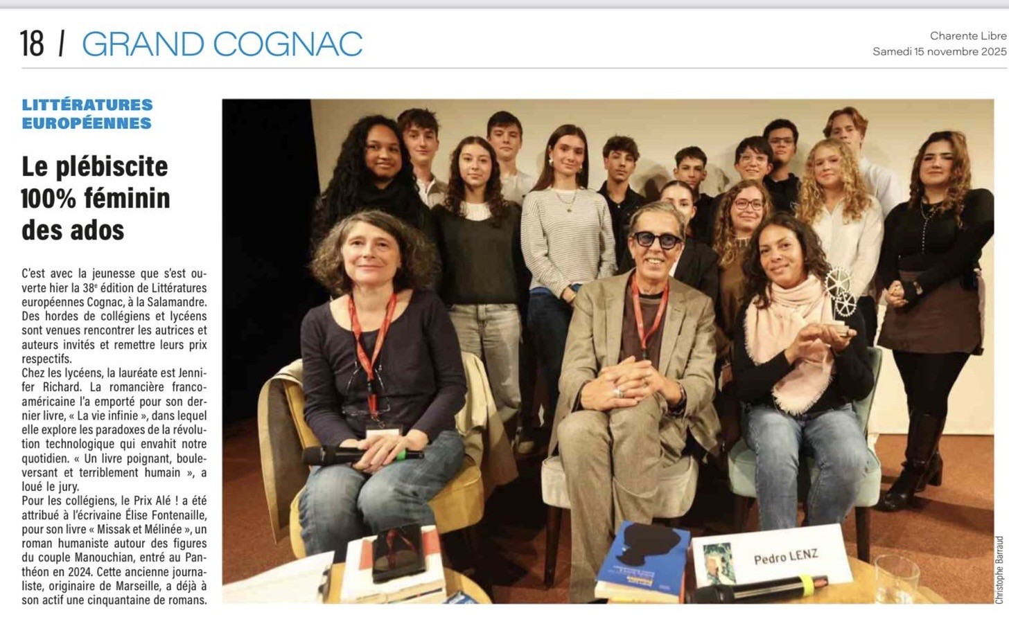 C’est Jennifer Richard pour « La Vie infinie » qui a reçu le prix JMJE 2025. Séance de questions-réponses, prise de parole des élèves délégués pour lire un extrait des 3 romans en lice, et pour déclamer un compliment à chaque auteur.